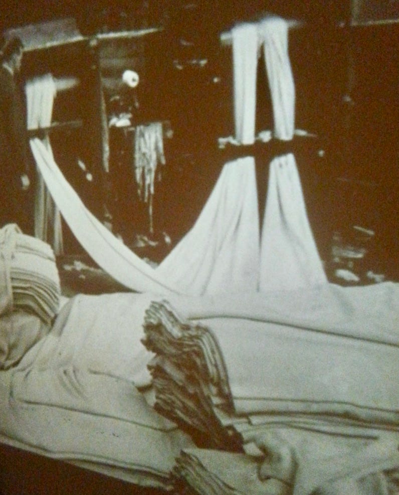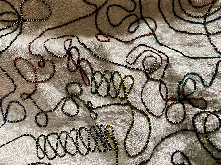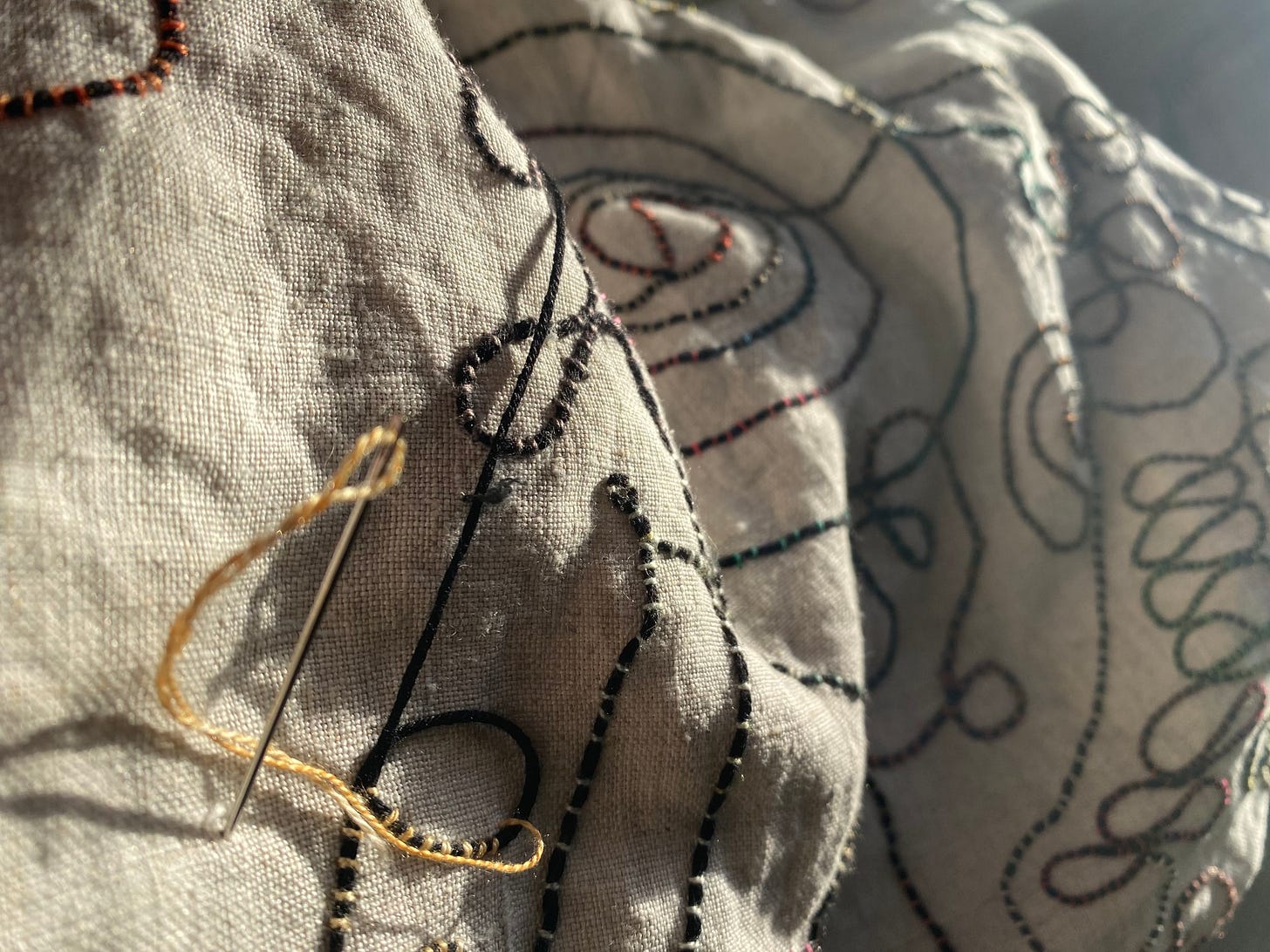 As with most of my pieces of durational work I thread my needle, pick up the cloth and begin. So much of my working life involves planning: funding bids, structures for projects, writing outlines, evaluation frameworks, meetings. Some thinking about these practicalities creeps into my stitching, particularly if I’m dealing with deadlines, but the meandering line offers me space to think differently. The raised strand of the black thread on linen has created a surface that reminds me of something when I run my hand across it. It took a few weeks to work out that the patterns and whorls I’ve stitched feel a little like the surface of the candlewick bedspreads that covered the twin beds in my Grandma’s spare room when I was young.